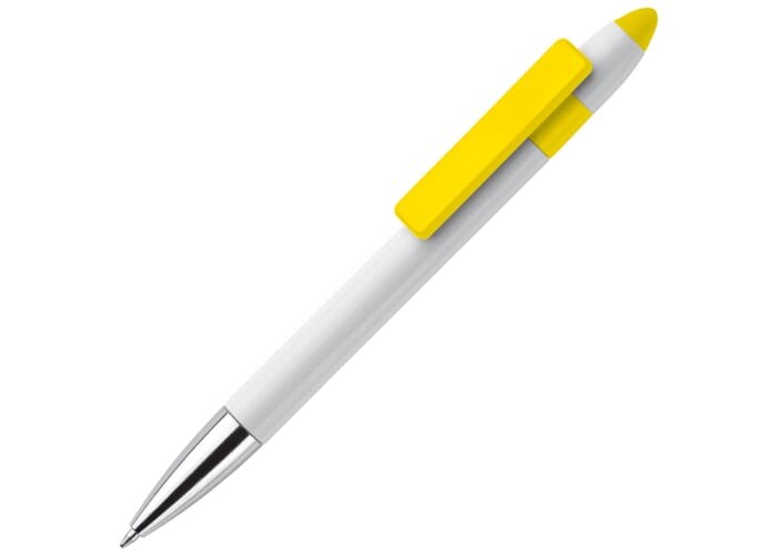 Styluspen California met gemetaliseerde tip. De houder is wit, de clip en stylus zijn in meerdere moderne kleuren verkrijgbaar. Robuuste pen met draaimechanisme. De clip is geschikt voor digitale druk.