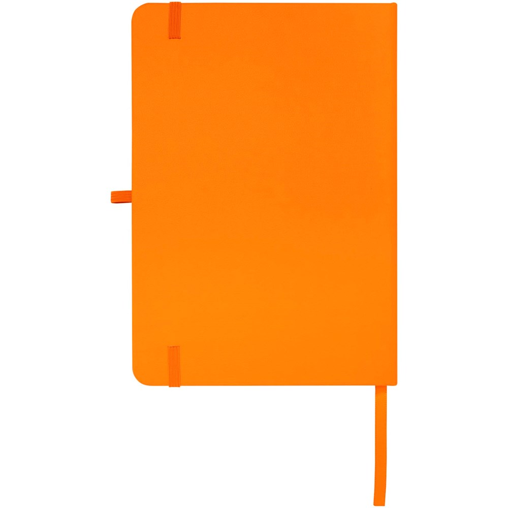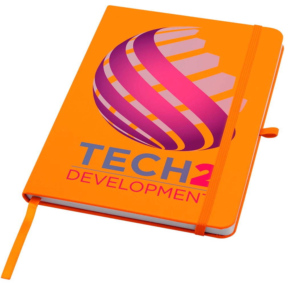 Het Teak A5 notitieboek met harde kaft en afgeronde hoeken is niet alleen onmisbaar op kantoor, maar ook een geweldige kans om je merk te promoten. Het notitieboek heeft 96 gelinieerde vellen van 70 g/m2 papier en een zacht aanvoelende cover. Wordt geleverd met een pennenlus, elastische sluiting en lintmarkering.