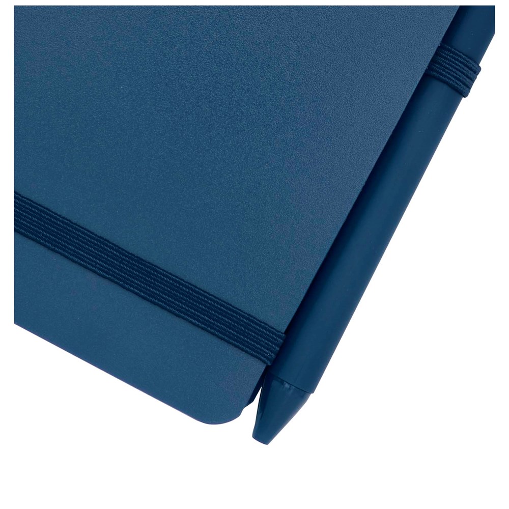 Het Thalaasa A6 notitieboek met harde kaft is gemaakt van ocean-bound plastic en heeft 80 gelinieerde vellen crèmekleurig papier van 70 g/m². Het notitieboek heeft afgeronde hoeken, een elastische sluiting en een pennenlus. De balpen met zwarte inkt is ook gemaakt van gerecycled plastic uit de oceaan. Schrijflengte: 1000 meter. Stiftmaat: 1,0 mm.