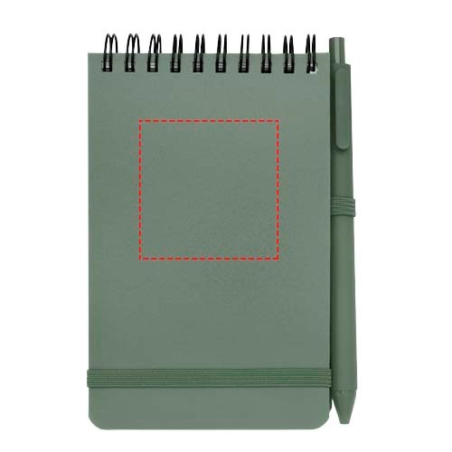 Het Thalaasa A6 notitieboek met harde kaft is gemaakt van ocean-bound plastic en heeft 80 gelinieerde vellen crèmekleurig papier van 70 g/m². Het notitieboek heeft afgeronde hoeken, een elastische sluiting en een pennenlus. De balpen met zwarte inkt is ook gemaakt van gerecycled plastic uit de oceaan. Schrijflengte: 1000 meter. Stiftmaat: 1,0 mm.