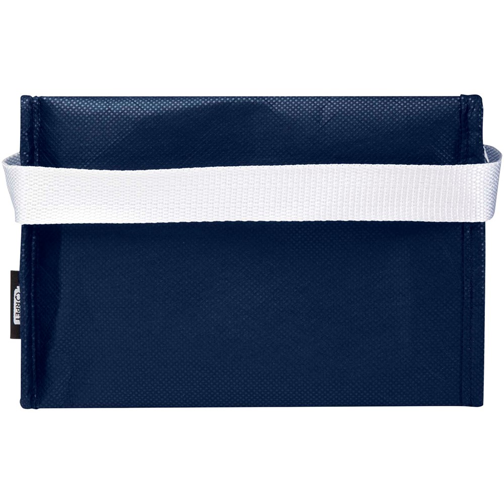 Gemaakt van duurzaam en scheurbestendig non-woven RPET. De 6-can Spectrum gerecyclede koeltas is geschikt voor maximaal 6 blikjes en heeft een gemakkelijk te dragen geweven handvat. Inhoud: 4 liter.