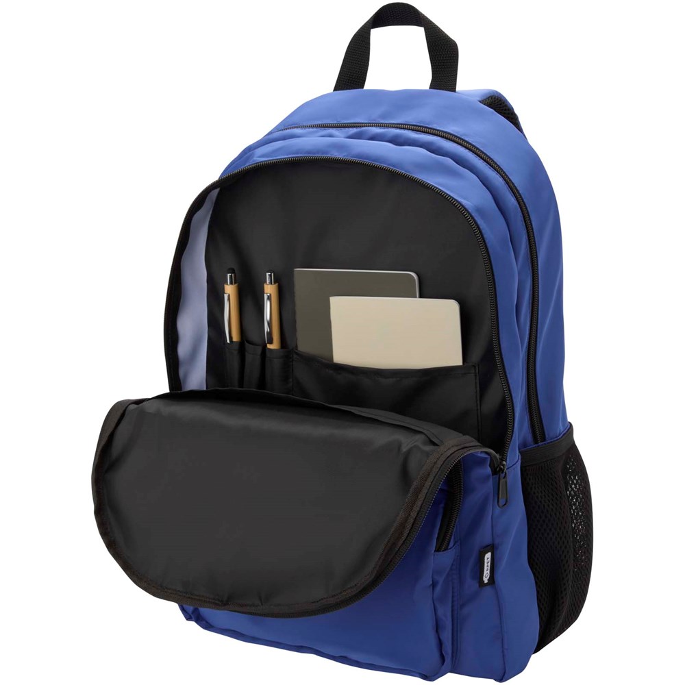 De Trend Plus rugzak is gemaakt van GRS-gecertificeerd gerecycled zacht en kreukvrij materiaal en een hoogwaardige RPET-voering. De rugzak beschikt over een 15” laptopvak, een opbergvak, ritsvakken aan de voorkant, elastische mesh zijvakken en een achterkant van ventilatiemesh met een trolleyband. Verstelbare schouderbanden voor optimaal draagcomfort. Inhoud: 20 liter. Geschikt voor een gewicht tot 10 kg. PVC-vrij.