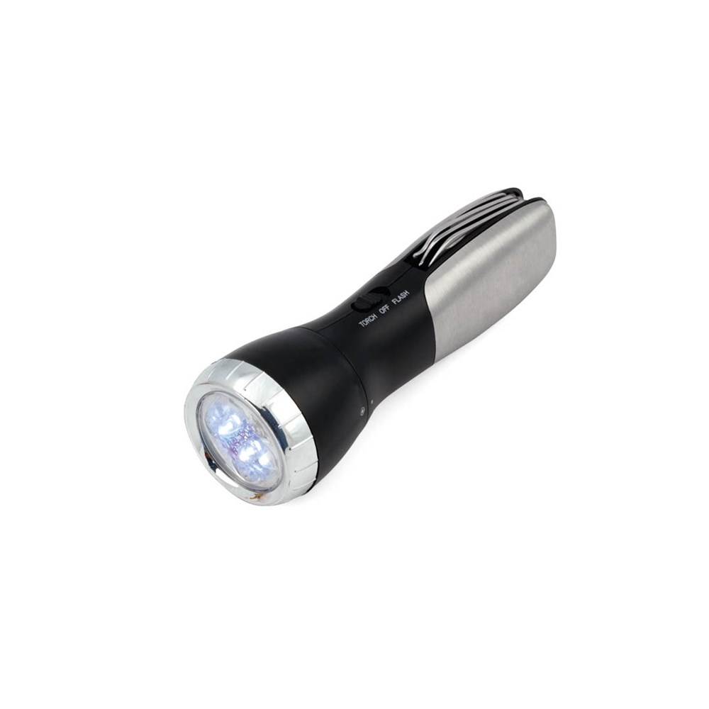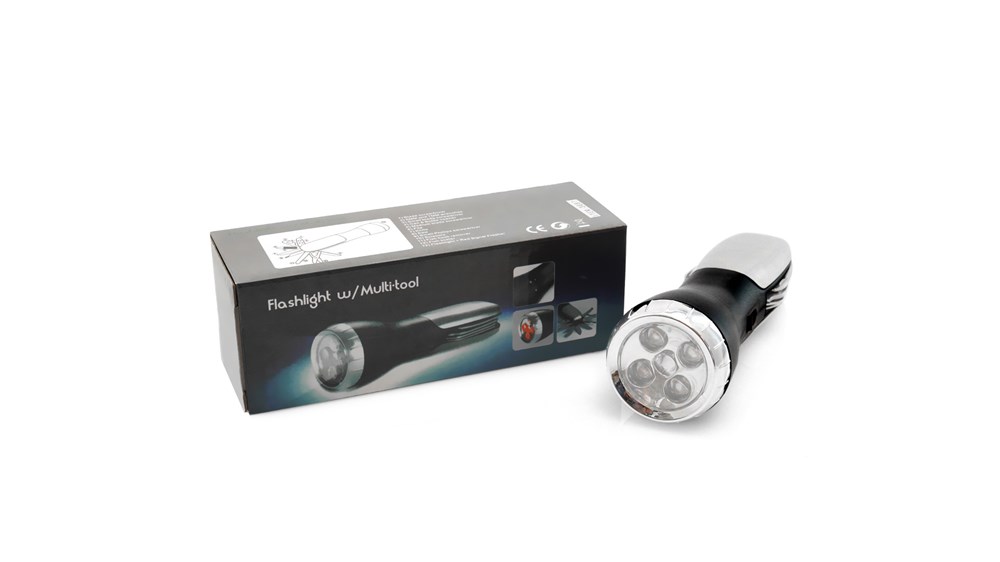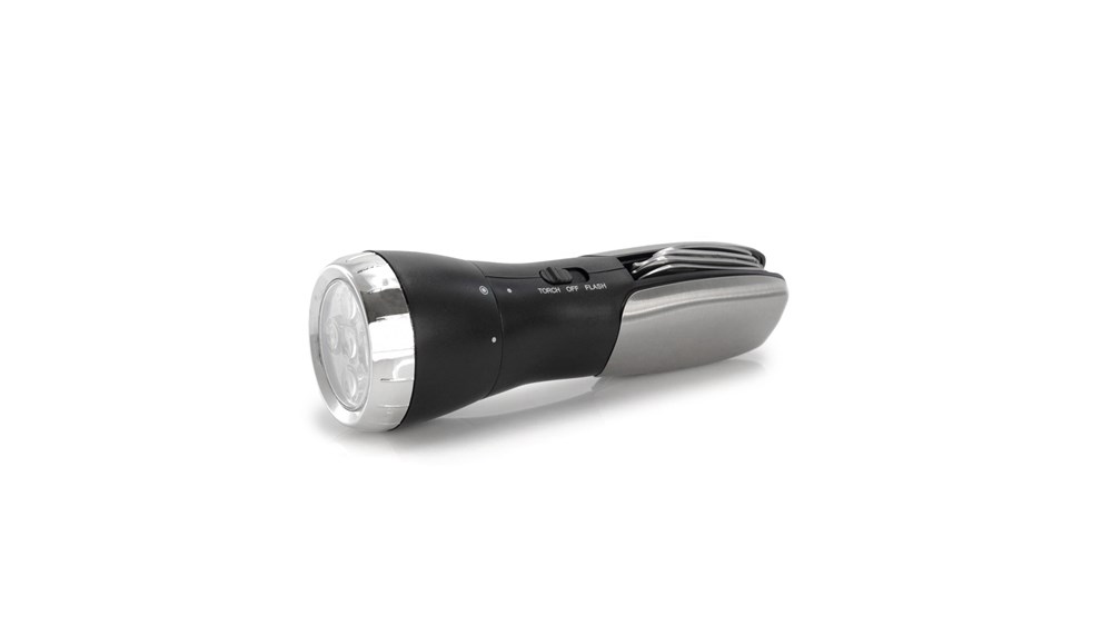 Multitool met stevig antislip afwerking in metallic kleur. Met 12 functies en ingebouwd 4 LED-zaklamp. Inclusief schroevendraaierkoppen, messen, sleutels, schaar en opener. Gepresenteerd in een doos. Batterij 1xAAA niet inbegrepen.