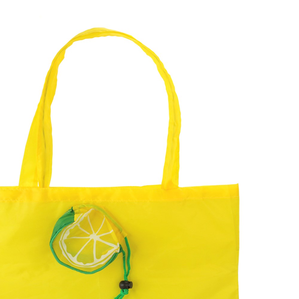 Opvouwbare tas met leuke, fruitige ontwerpen in diverse kleuren. Gemaakt van zacht 170T polyester, met trekkoord in bijpassende kleur en verstelaccessoire. Gestikte afwerking.