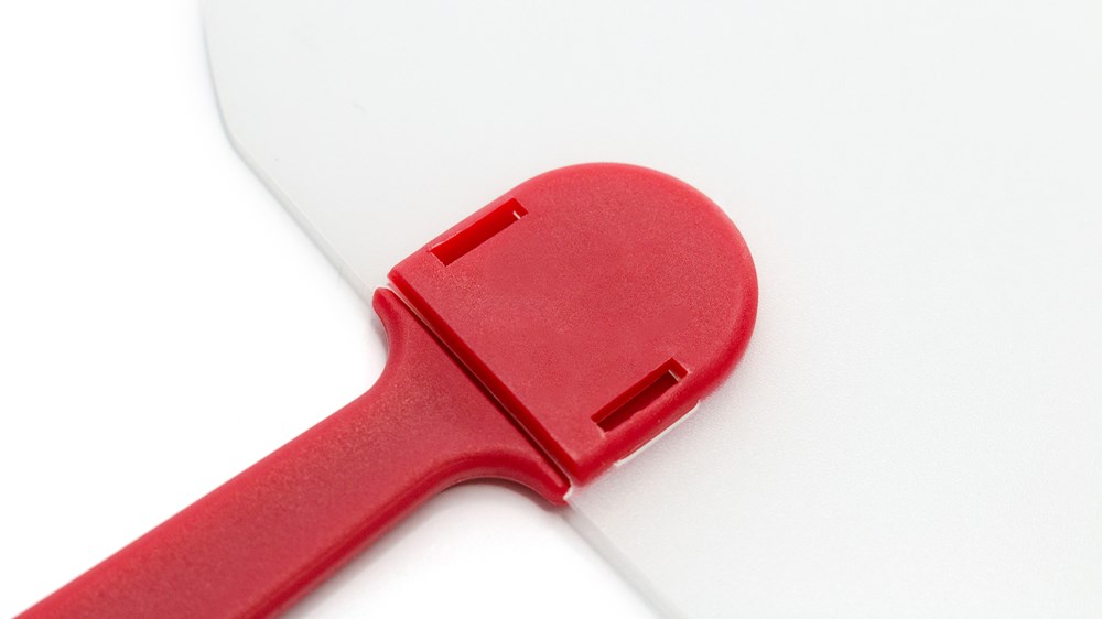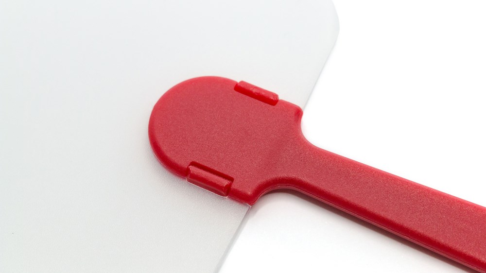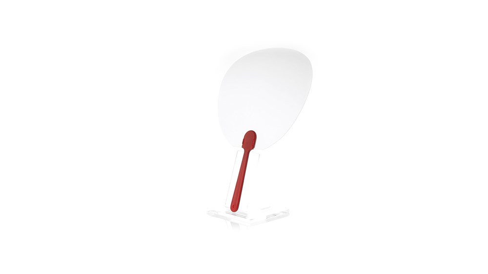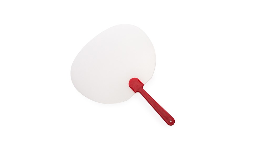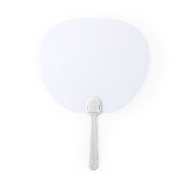 Handwaaier met witgekleurd oppervlak in doorschijnende afwerking en handvat in verschillende kleuren.