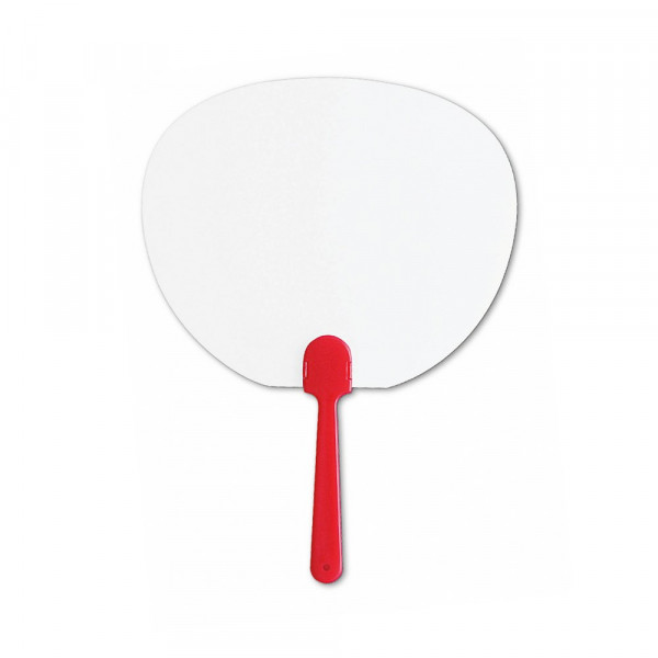 Handwaaier met witgekleurd oppervlak in doorschijnende afwerking en handvat in verschillende kleuren.