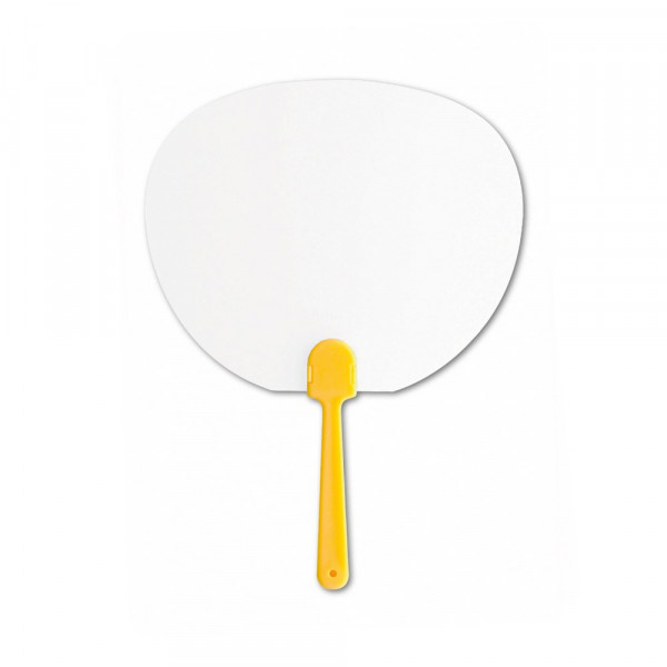 Handwaaier met witgekleurd oppervlak in doorschijnende afwerking en handvat in verschillende kleuren.