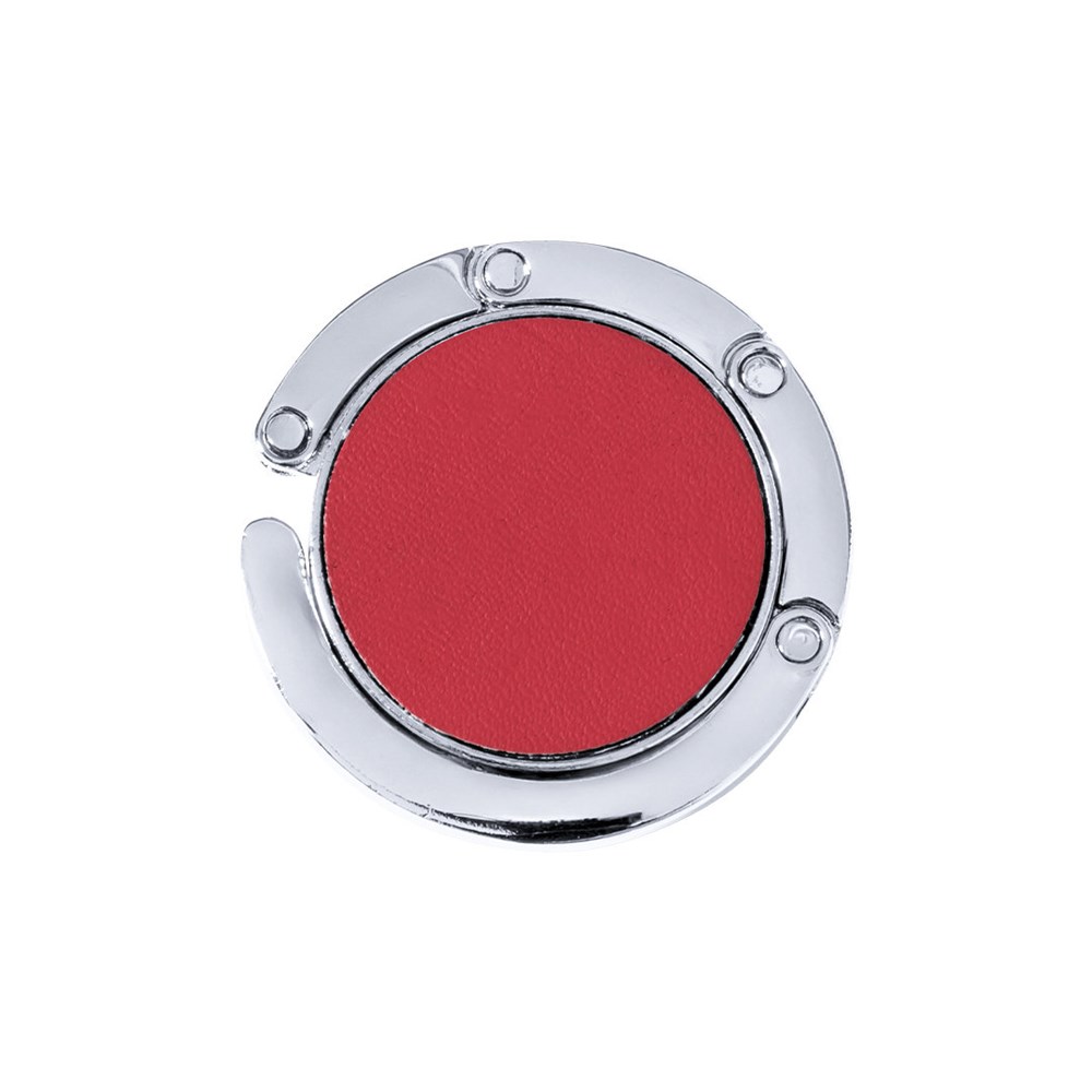 Opvouwbare metalen tashanger met lederen PU vlak in diverse kleuren. Gepresenteerd in een individuele doos met gestanste binnenkant.