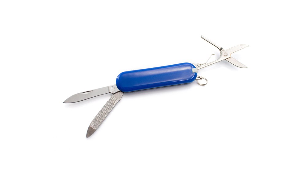 Multifunctioneel mini-mes met roestvrij stalen accessoires, 6 functies in gevarieerde kleuren. Omvat mes, tang, vijl, tandenstoker, sleutelhanger en schaar. Gepresenteerd in een individuele doos.