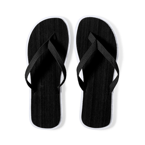 Set flip-flops met dikke zolen in van stevigt EVA met tweekleurige afwerking en nylon bandjes in bijpassende kleur. In verschillende kleuren en verkrijgbaar in de maten 36-38, 42-44.