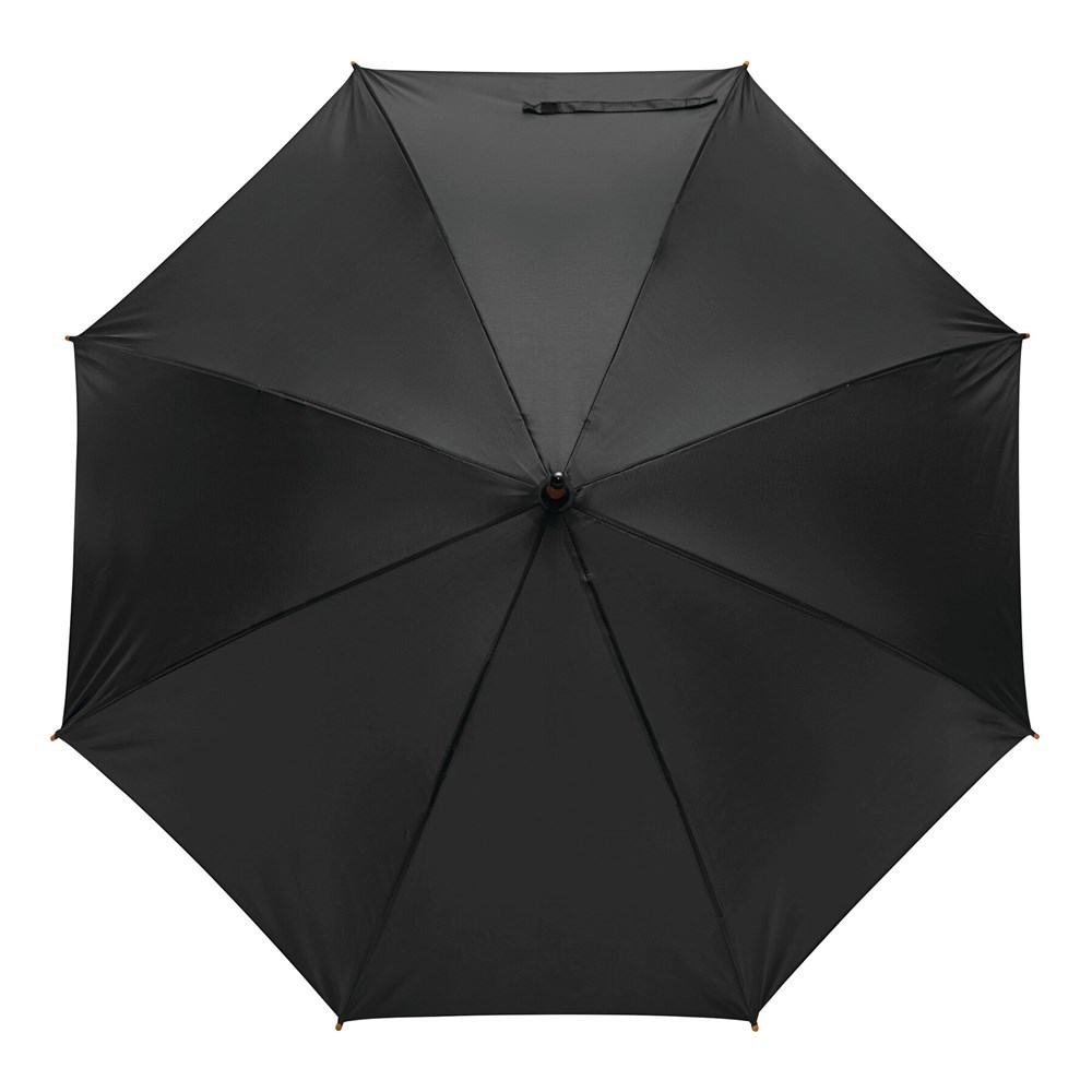 Automatische paraplu met houten steel JAZZ: glasvezel baleinen, houten tips en ronde haakhandvat, polyester pongee hoes van gerecycled plastic / RPET, sluitbandje met klittenbandsluiting.
