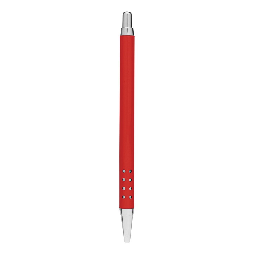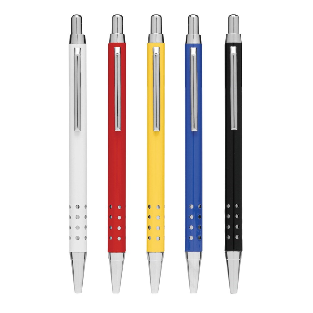 Messing balpen BUDAPEST: barrel met gaatjes-design, drukknopmechanisme, grote vulling, blauwschrijvend
