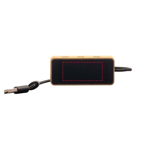 8-in-1 USB-hub gemaakt van verantwoord geproduceerd bamboe en rPET, die tot 6 apparaten tegelijk kan aansluiten met 3 USB-A- en 3 Type-C-poorten. Hij is volledig compatibel met moderne computers, heeft een aanpasbaar led-logo en wordt geleverd in een geschenkverpakking van gerecycled karton, waardoor functionaliteit wordt gecombineerd met een geweldig design. Overdrachtssnelheid: USB/480 Mbps. Afmetingen: 8 x 3,5 x 1,5 cm. Kabellengte: 24 cm.