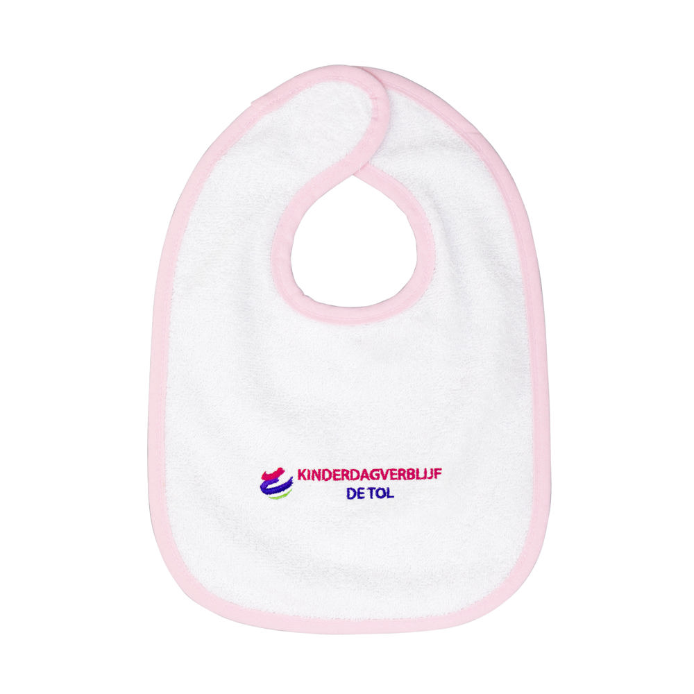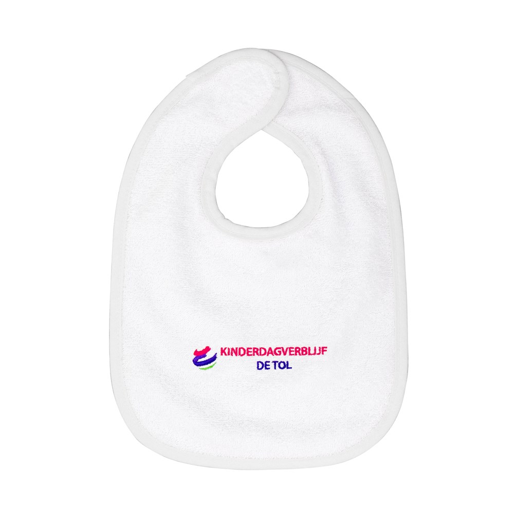 Badstof slab met klittenbandsluiting, Oeko-Tex Standard 100 gecertificeerd. Inclusief borduring 10x6 cm, volvlakborduringen op aanvraag