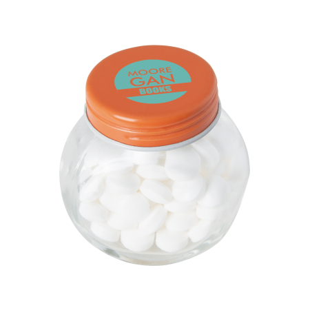 Kleine glazen pot gevuld met ca. 40 gr. mints gekleurd deksel, 53x35x55 mm, met bedrukking op...meer