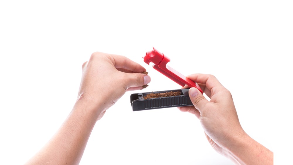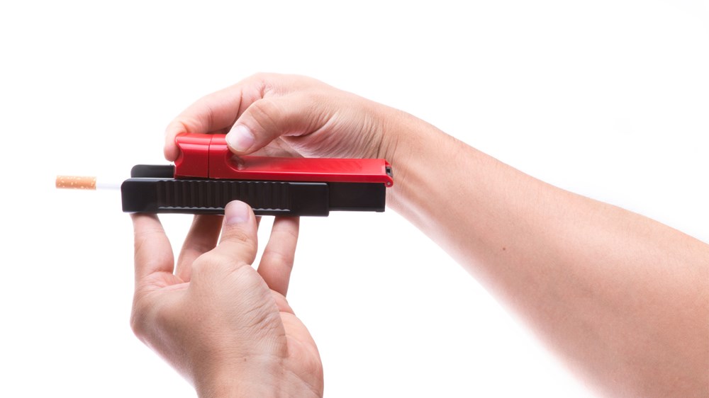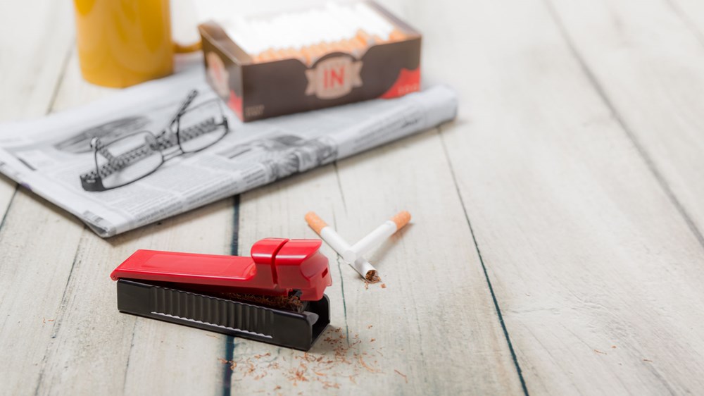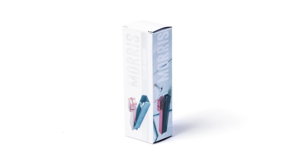 Tabak vulmachine in tweekleurig design en in een gevarieerd kleuren. Met buisdrukknop en gepresenteerd in een individuele designdoos.