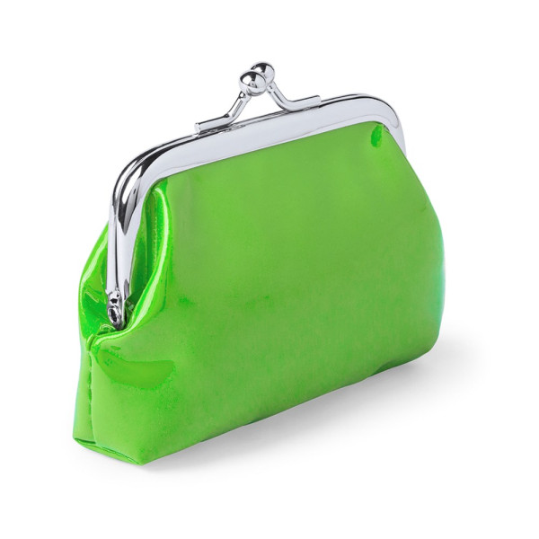 Portemonnee in een vrolijk ontwerp met zachte body van glanzend PVC in verschillende kleuren. Hoofdvak met versterkte, metalen gespsluiting.