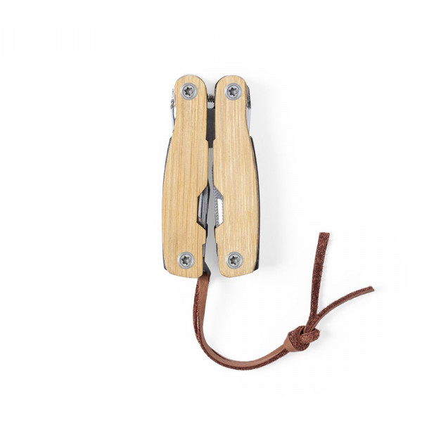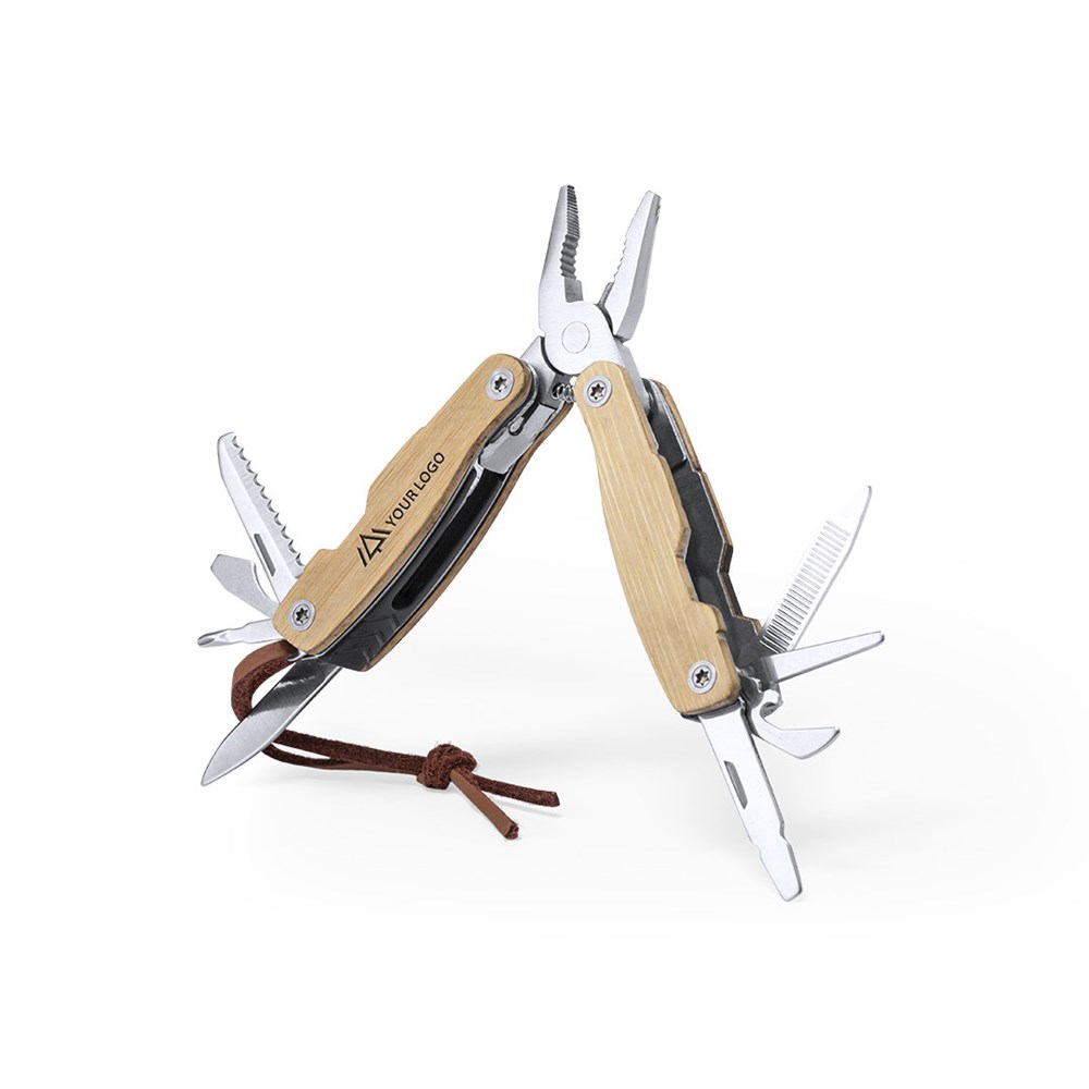 Multigereedschap met resistente roestvrijstalen behuizing en bamboe handvat, 12 functies. Inclusief messen en bladen, schroevendraaiers, vijlen, openers en tangen. Met PU lederen draagriem en gepresenteerd in een individuele doos.