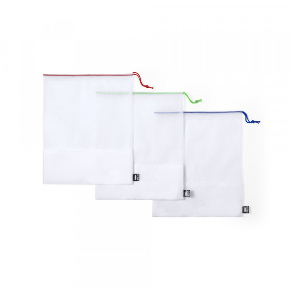 Natuurlijn set van tassen in resistent RPET, gemaakt van gerecycleerd plastic om het hergebruik van plastic afval te bevorderen en bij te dragen aan de duurzaamheid van de planeet. Inclusief 3 stuks van 25x30 cm met gekleurde trekkoordsluiting en RPET-onderscheidingsteken op het etiket aan de buitenkant. Met een groot drukoppervlak aan beide zijden van de zakken.
