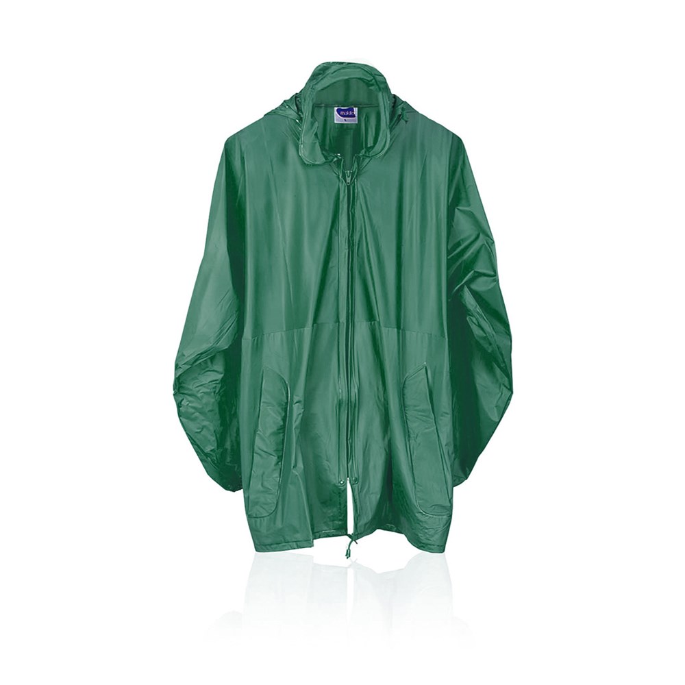 Regenjas van stevig PVC met een verzegelde afwerking in verschillende kleuren. Met ingebouwde capuchon achter ritssluiting op kraag met koortjes. Hoofdsluiting met ritssluiting en steekzakken. Om te wouwen tot heuptas met elastische banden en bijpassende gespsluiting in bijpassende kleur. Verkrijgbaar in de maten M-L, XL-XXL.