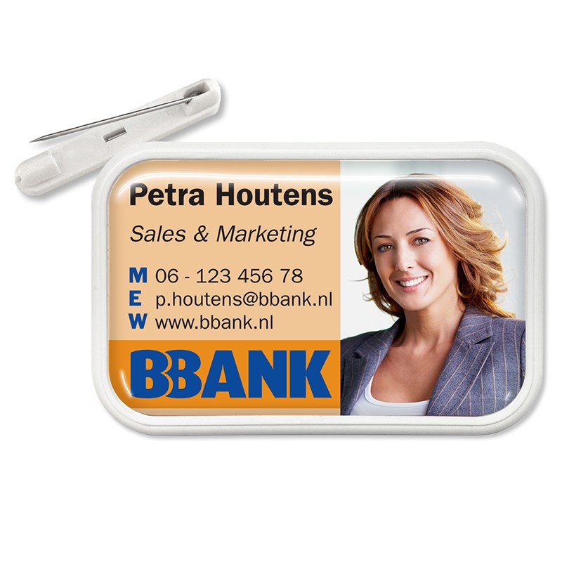 Plastic naambadge inclusief een dominglabel met formaat 70x43 mm. Van de badge blijft een subtiele witte rand rondom zichtbaar. Maak het dominglabel binnen het aangegeven formaat vrij op naar eigen wens in bijvoorbeeld je eigen huisstijl of die van de klant. Door de dominghars krijgt het label een blinkende uitstraling. De badge wordt bevestigingd met een speldsluiting.