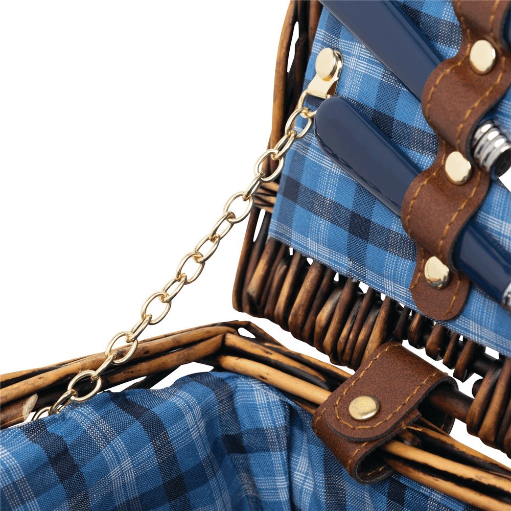 Picknickmand SUMMERTIME met in de mand bevestigingsbanden en aan de buitenkant een handvat, schouderband en een draaislot. Inclusief kunstof champagneglazen, messen, vorken, lepels en borden voor 4 personen.