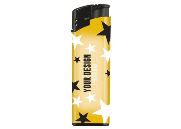 Elektronische aansteker voorzien van custom-made full-colour labelling. Navulbaar en kindveilig. Verkrijgbaar vanaf 5.000 stuks.