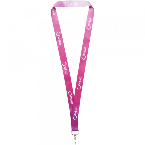 Lana full colour sublimatie lanyard. Bedrukking is beschikbaar aan één of beide zijden. Voor dubbelzijdige bedrukking kun je kiezen uit de standaard of fitted optie (fitted betekent dat de bedrukking aan beide zijden gelijk is). Lanyard heeft een metalen haak, geschikt voor een naambadge, ID-kaart of sleutels. Verkrijgbaar in 4 verschillende breedtes: 10, 15, 20 en 25 mm.