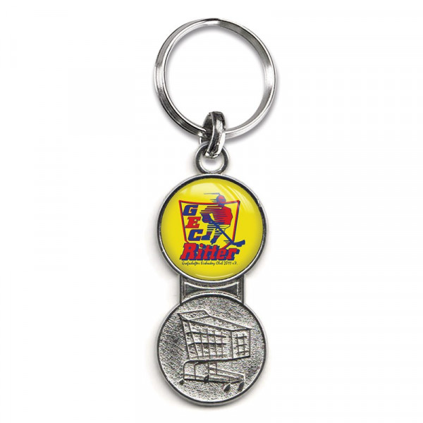 Metalen sleutelhanger met de vorm van een winkelwagenmunt eraan. Op de hanger is een dominglabel met formaat Ø 21 mm gemonteerd. Dit is een stevige en superhandige sleutelhanger, waarbij je geen gedoe hebt met losse muntjes en waarbij je aan een zijde een leuke afbeelding kunt plaatsen in het dominglabel.