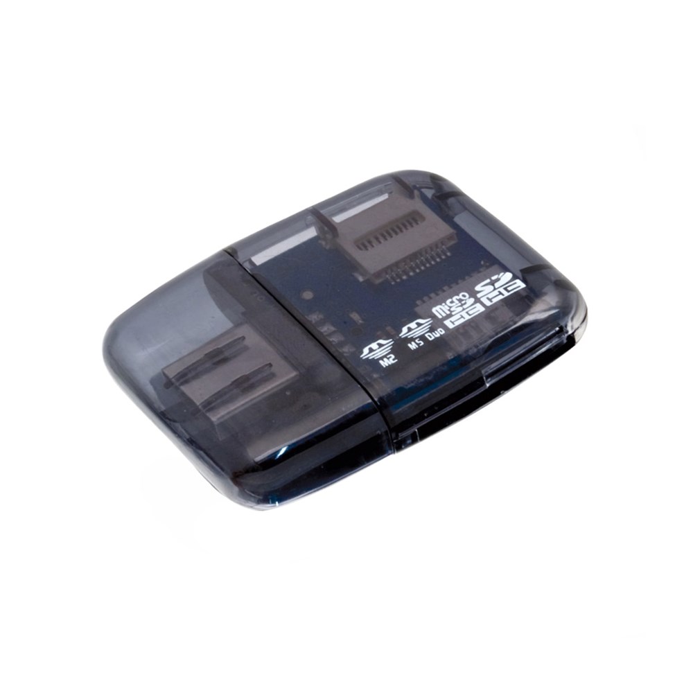 Kaartlezer met USB 2.0-aansluiting in leuke, doorschijnende kleuren. Compatibel met M2, MS Duo, micro SD- en SD-kaarten. Gepresenteerd in een doos.