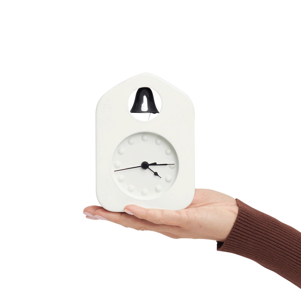 Analoge bureauklok BELL in de vorm van een klokkentoren met een metalen bel en alarmfunctie.meer