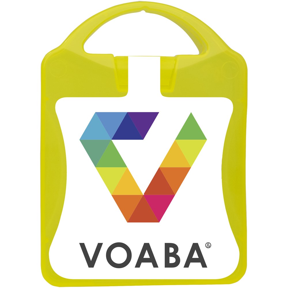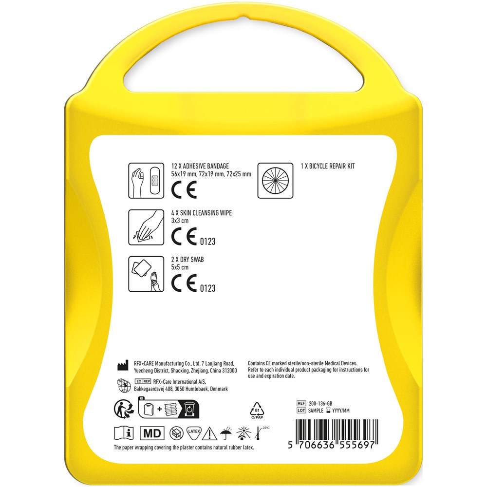 Deze Mykit is speciaal samengesteld voor fietsers. Of u nu de bergen in gaat of met het hele gezin op pad bent op vakantie. Met deze kit bent u voorbereid op eventuele kleine ongevallen tijdens het fietsen of een lekke band. Inhoud:12 Waterbestendige pleisters, 4 Vochtige reinigingsdoekjes, 2 Droge reinigingsdoekjes, 1 Fiets Repartiesetje. Alle eerste hulp en verzorgingsartikelen in de kit voldoen aan de EU regelgeving. Prijs is inclusief full colour bedrukking.